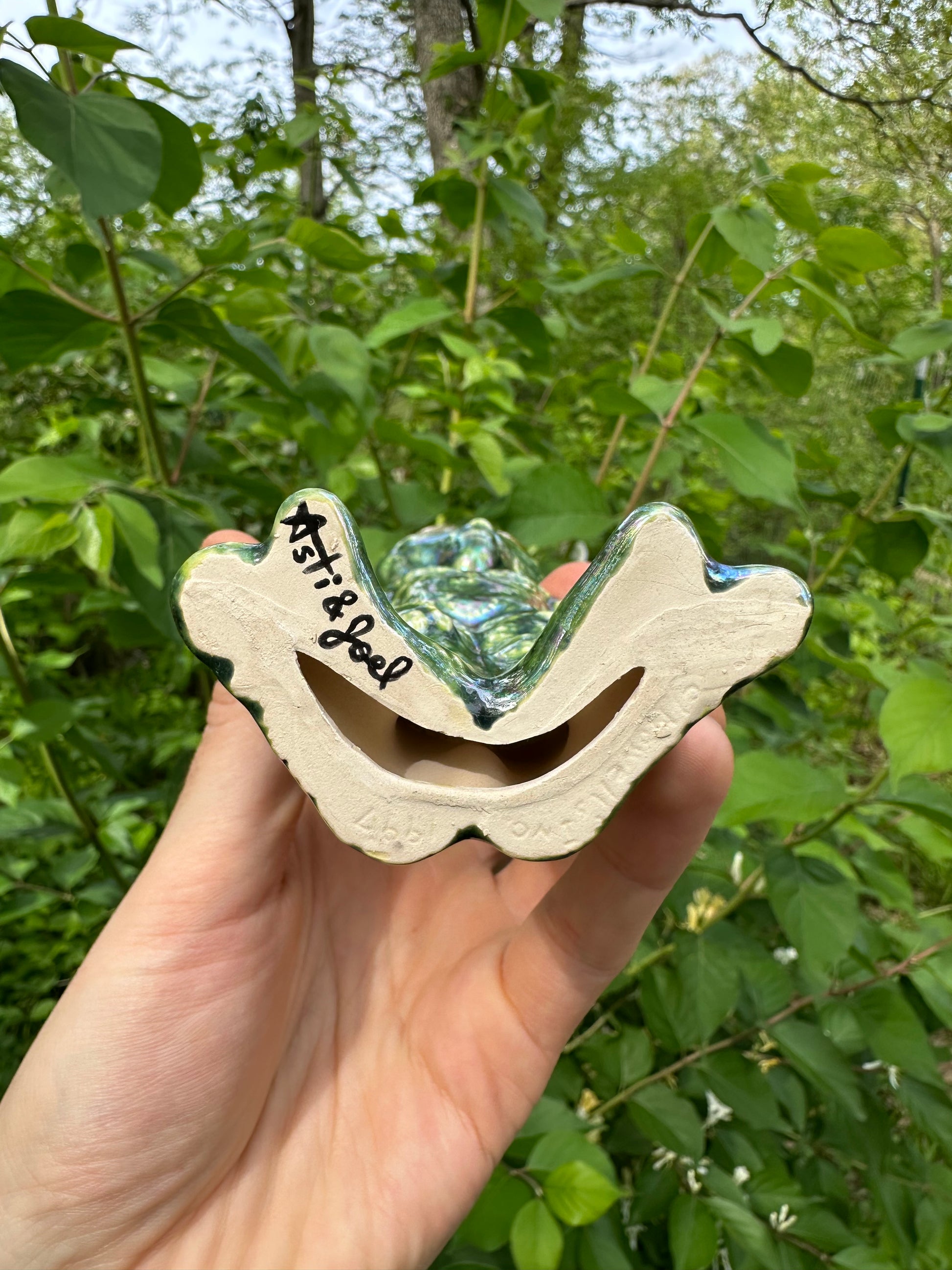 Meet your new cosmic companion — our handmade ceramic alien figure! Uniquely crafted with shimmering, iridescent glazes and finished with dazzling gold accents on the eyes and toes that sparkle like stardust. This curious extraterrestrial radiates mystery, charm, and out-of-this-world vibes — perfect for adorning your shelves, sparking conversation, or gifting to someone who believes the truth is out there. A stellar addition for collectors or anyone who loves the unusual, this little being is sure to bring otherworldly joy to those seeking the extraordinary.