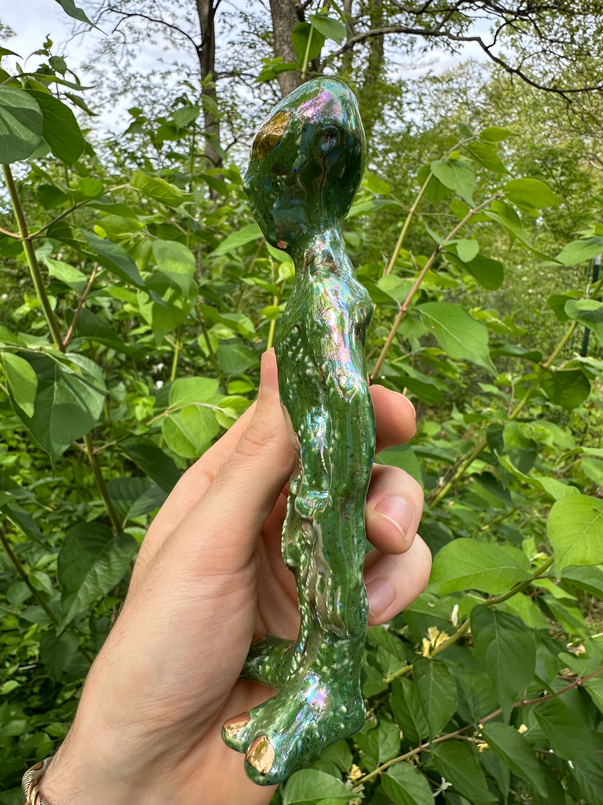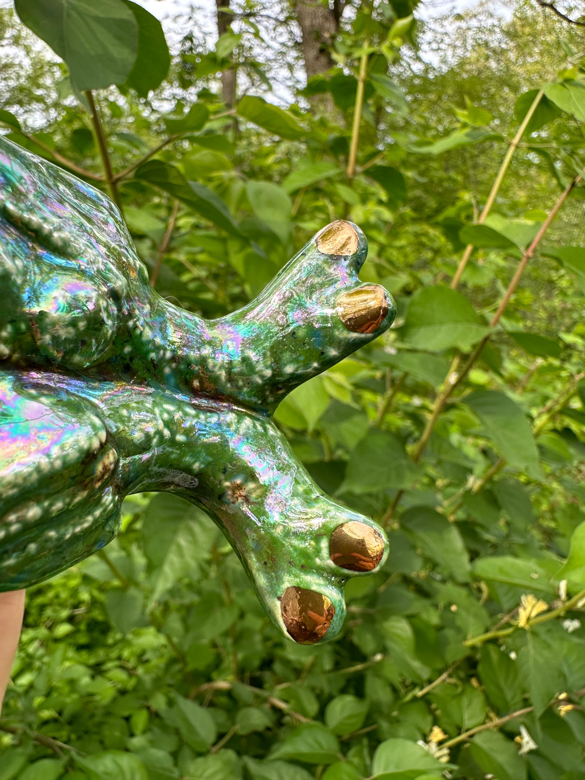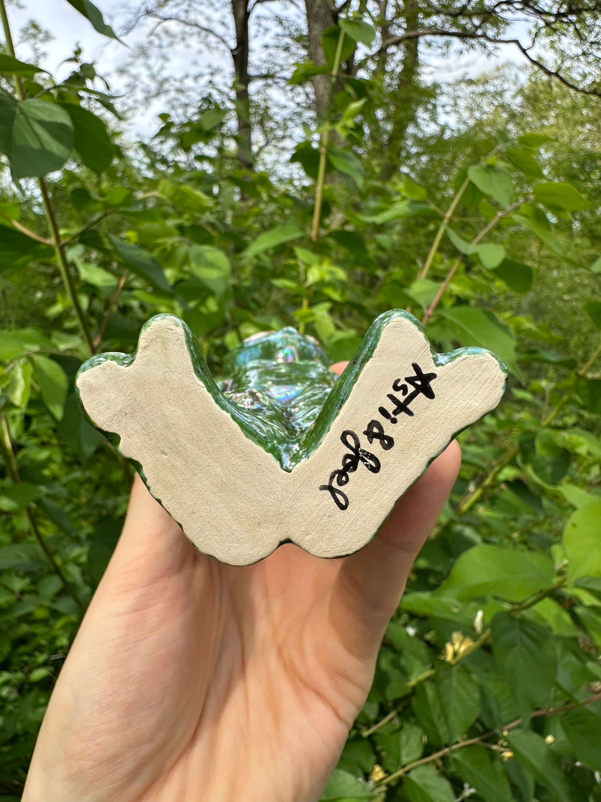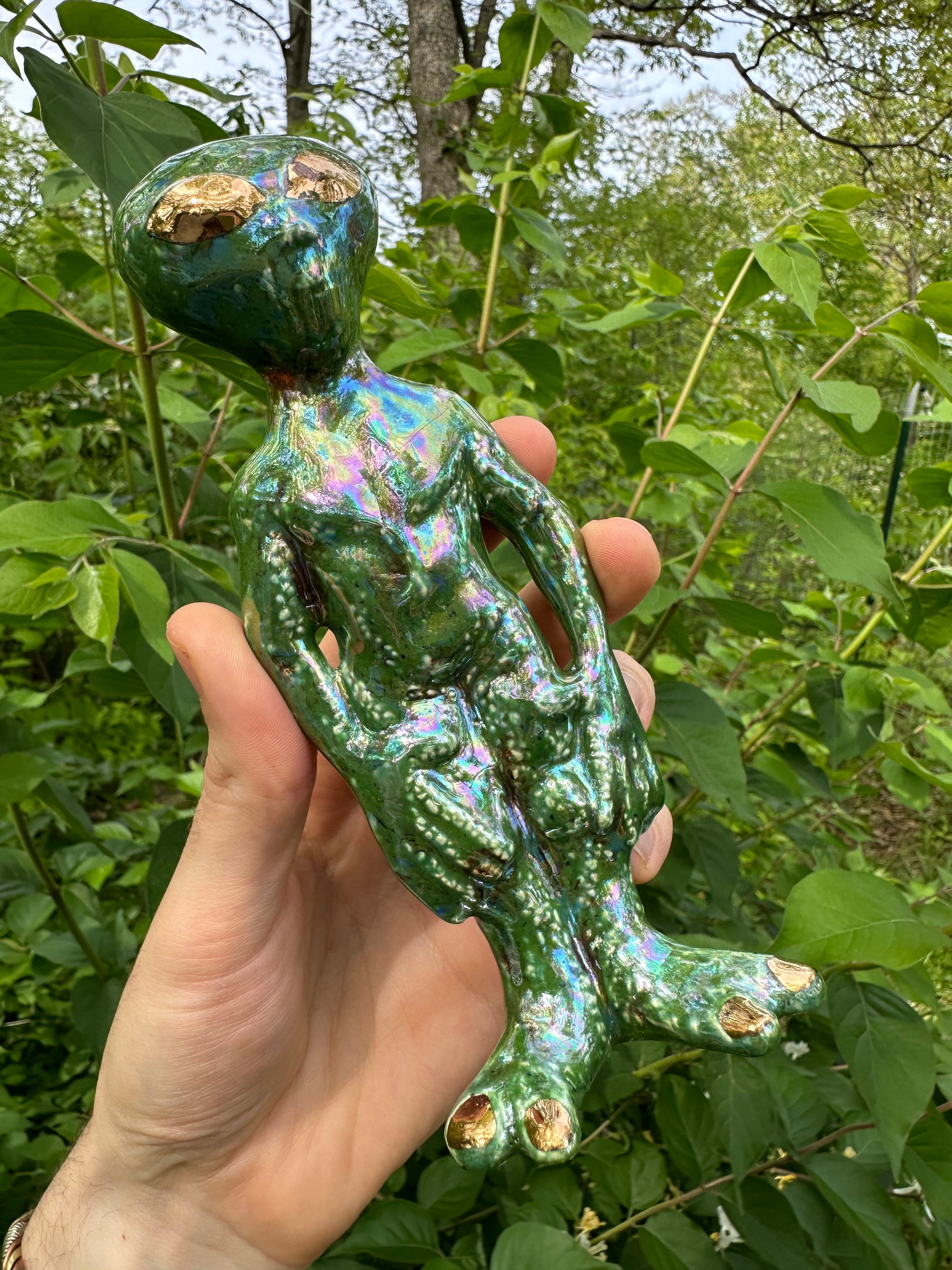 Meet your new cosmic companion — our handmade ceramic alien figure! Uniquely crafted with shimmering, iridescent glazes and finished with dazzling gold accents on the eyes and toes that sparkle like stardust. This curious extraterrestrial radiates mystery, charm, and out-of-this-world vibes — perfect for adorning your shelves, sparking conversation, or gifting to someone who believes the truth is out there. A stellar addition for collectors or anyone who loves the unusual, this little being is sure to bring otherworldly joy to those seeking the extraordinary.