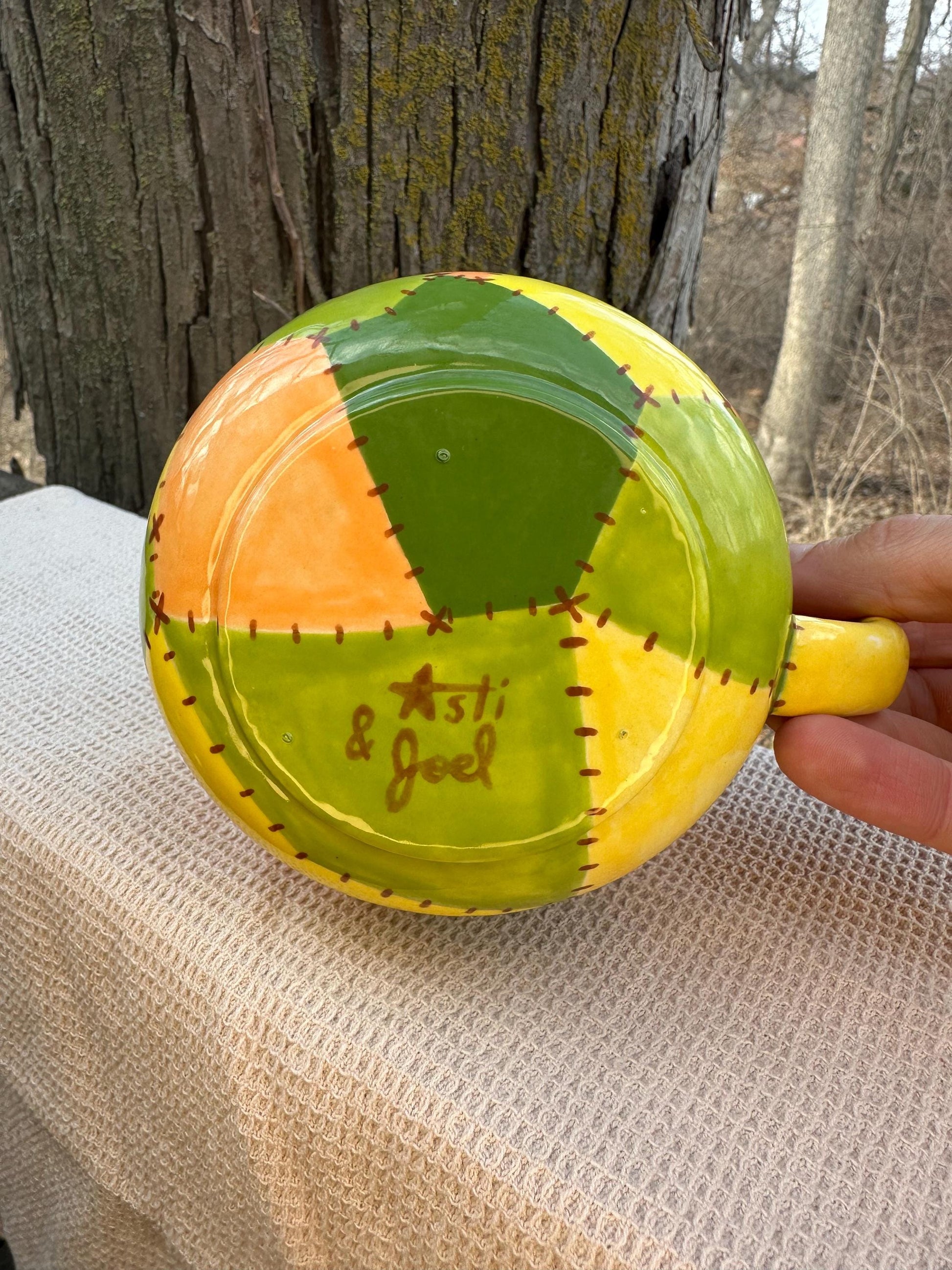 Brighten your table with our handmade ceramic soup mug, crafted from a vintage slip-cast plaster mold! This cheerful piece boasts a patchwork design in sunny yellow, warm orange, and lush green, with raised “SOUP” lettering that adds a playful touch — just hand wash gently to preserve its glossy, colorful charm. Food-safe and perfect for savoring soups, stews, or a cozy drink, it’s ideal for adding a burst of personality to your kitchen, sparking conversation, or gifting to someone who loves eclectic treasures. A vibrant addition for collectors or anyone who adores unique handmade finds, this mug is sure to bring a splash of joy to every meal.