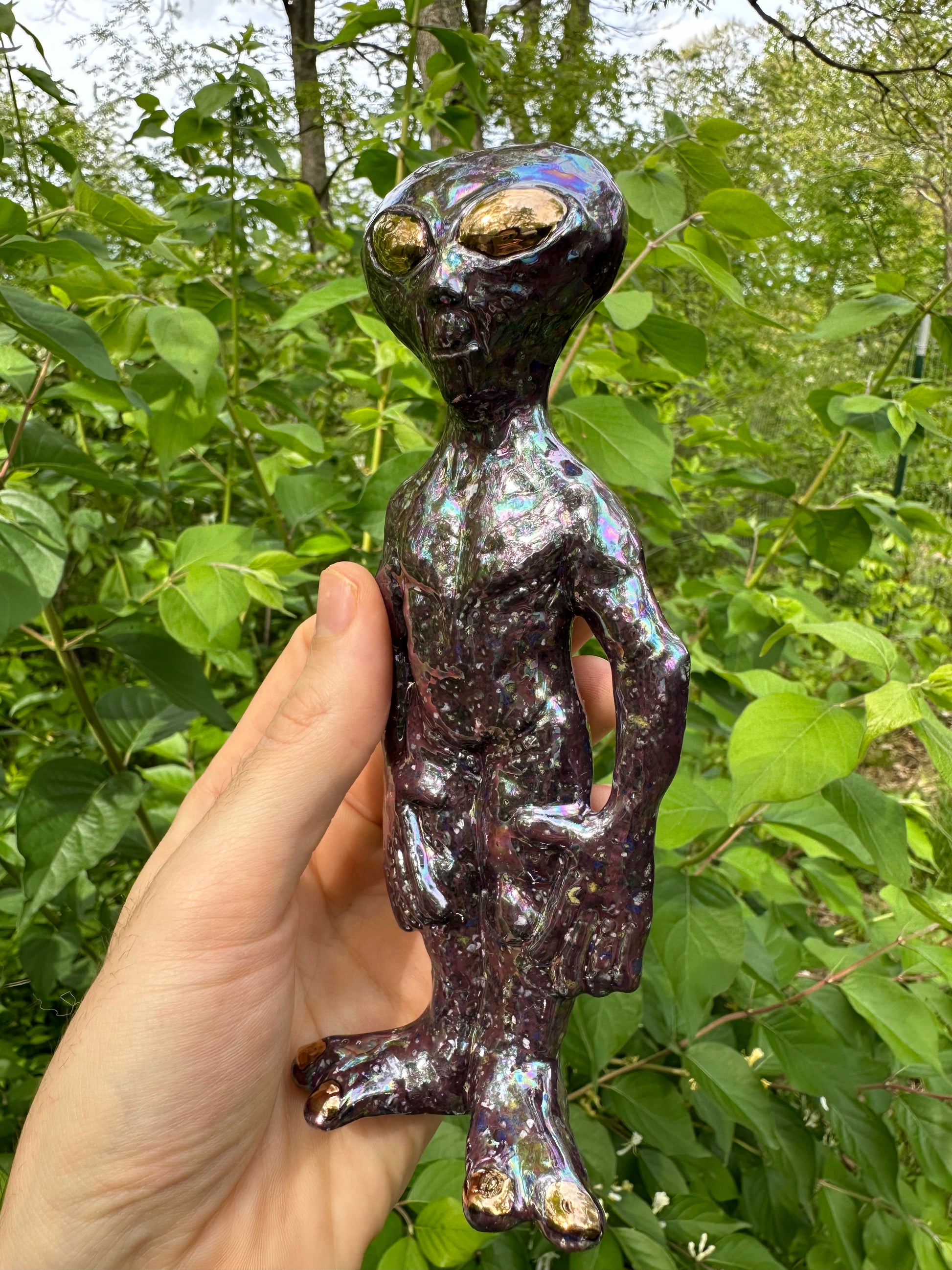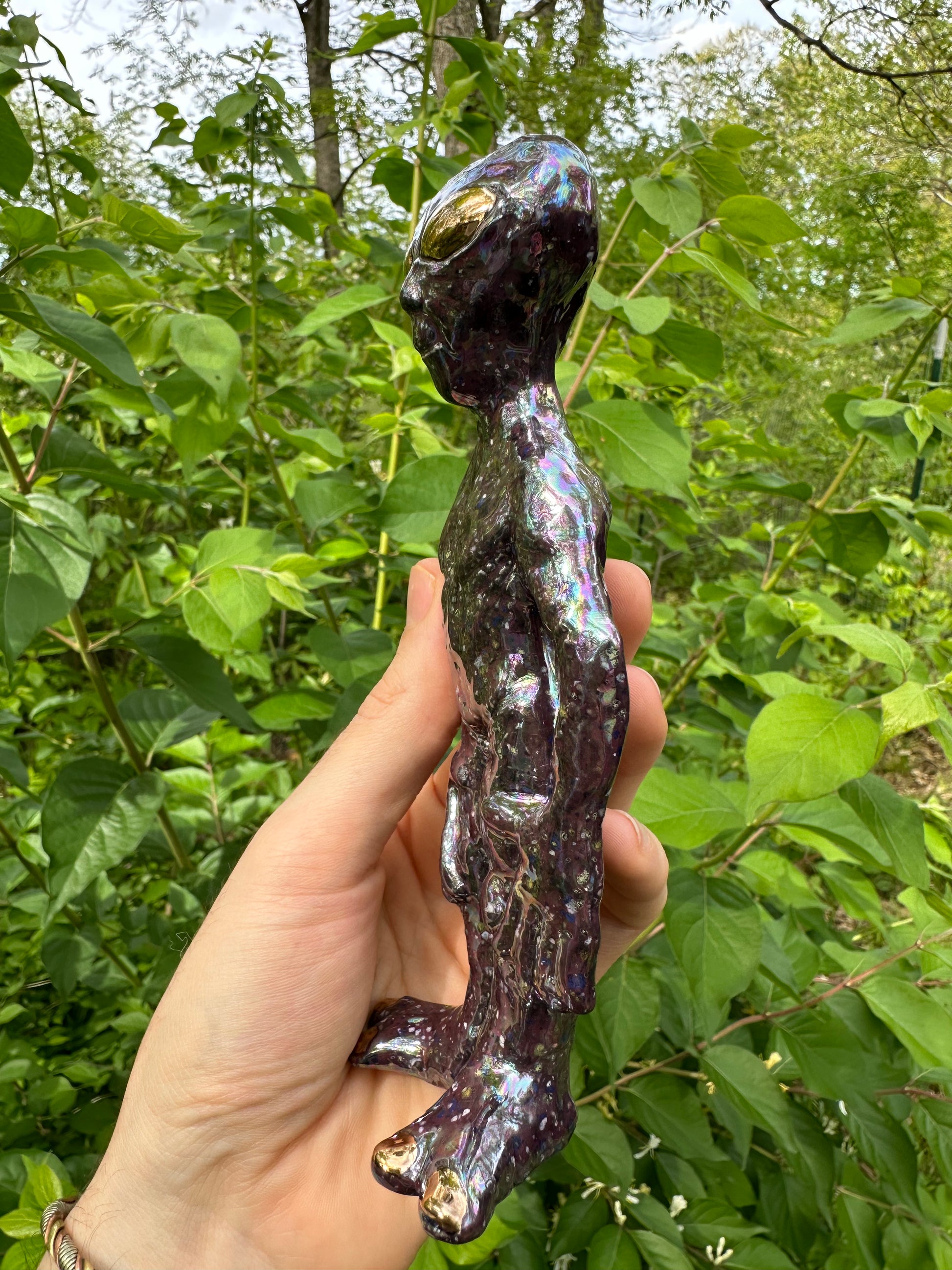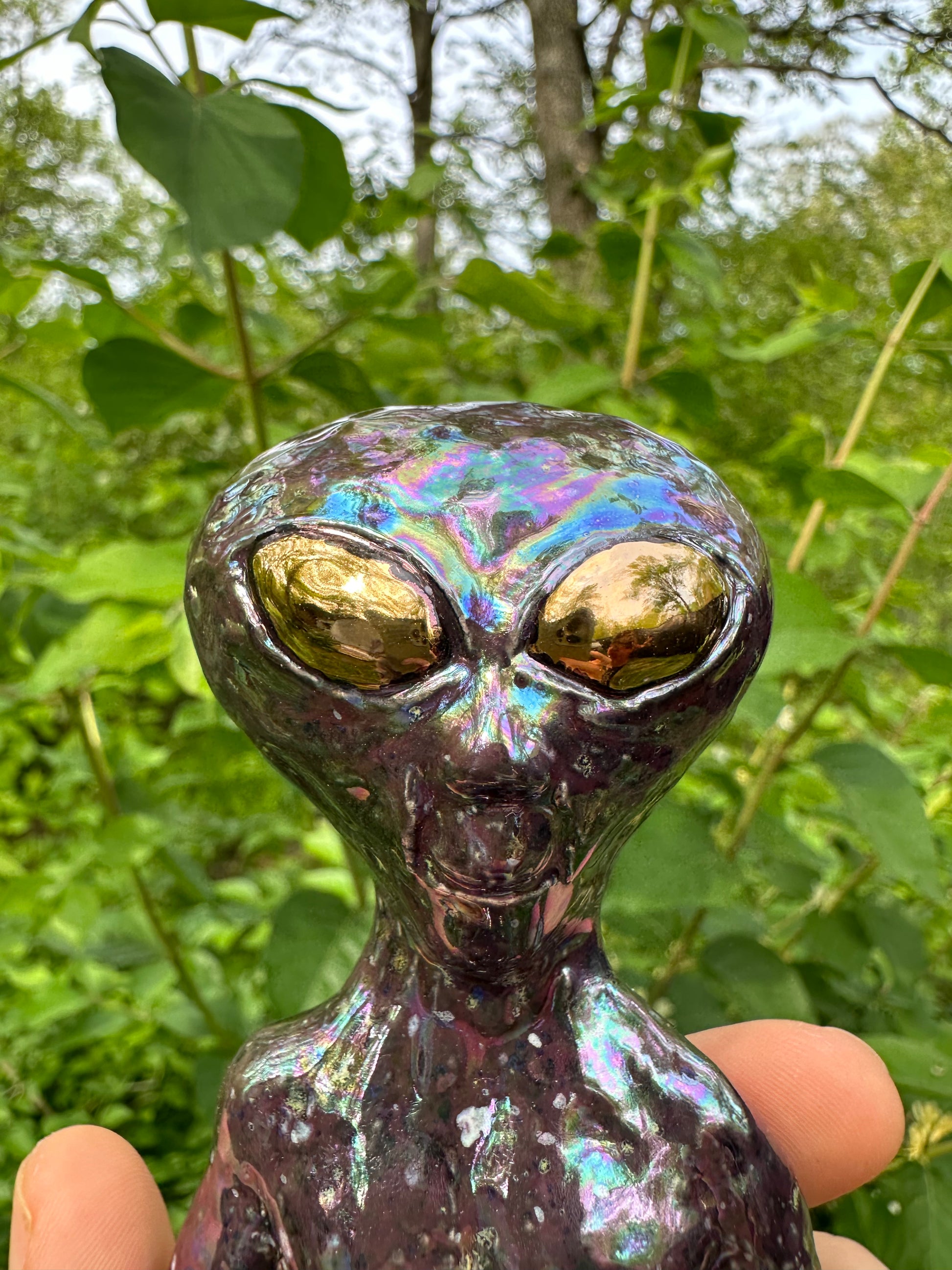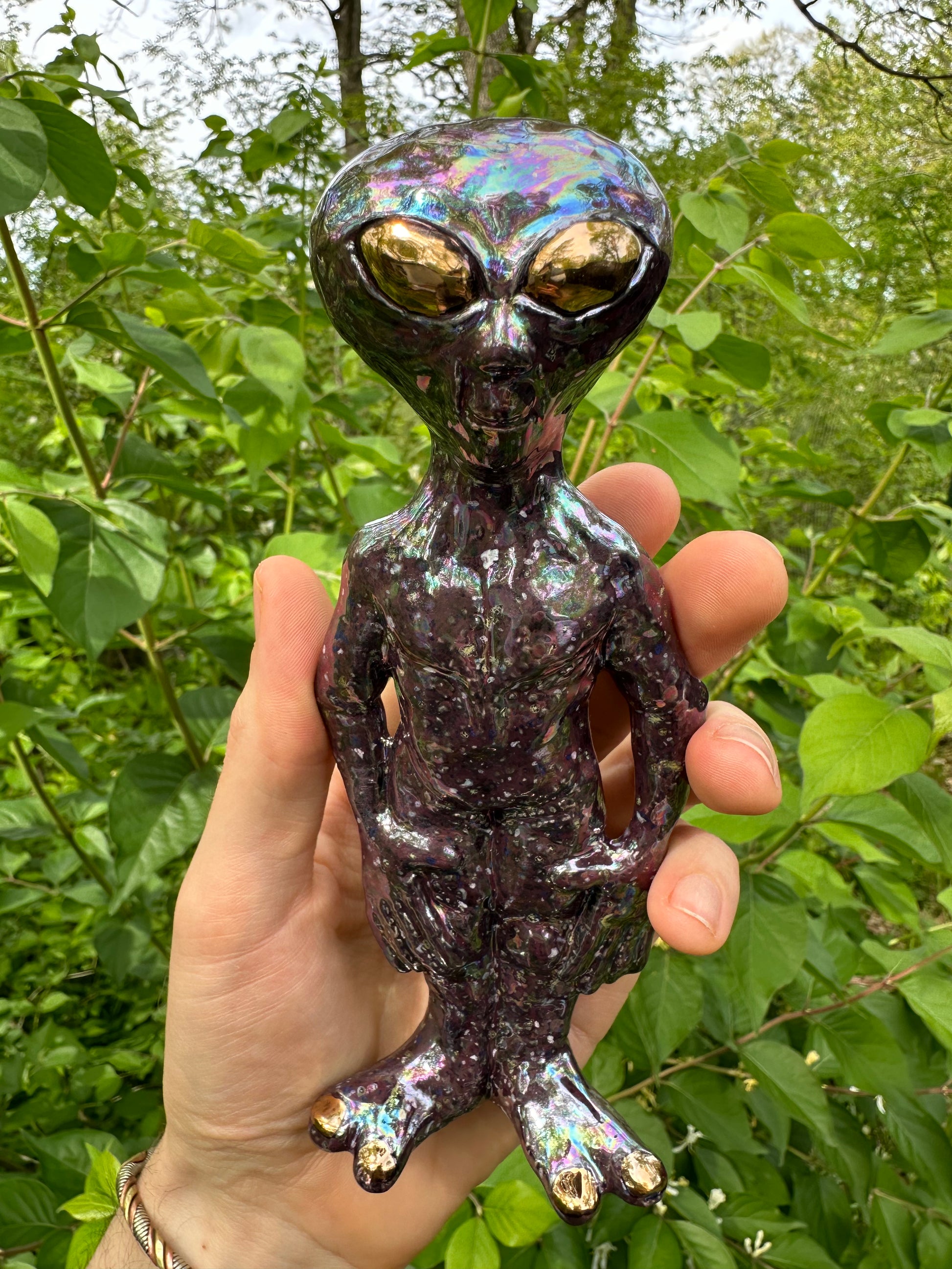 Meet your new cosmic companion — our handmade ceramic alien figure! Uniquely crafted with shimmering, iridescent glazes and finished with dazzling gold accents on the eyes and toes that sparkle like stardust. This curious extraterrestrial radiates mystery, charm, and out-of-this-world vibes — perfect for adorning your shelves, sparking conversation, or gifting to someone who believes the truth is out there. A stellar addition for collectors or anyone who loves the unusual, this little being is sure to bring otherworldly joy to those seeking the extraordinary.