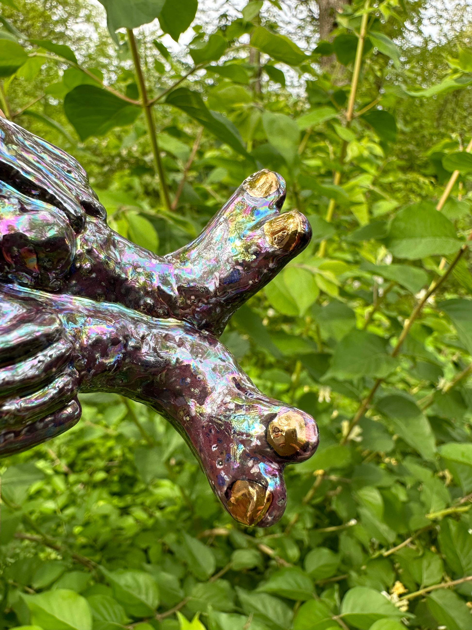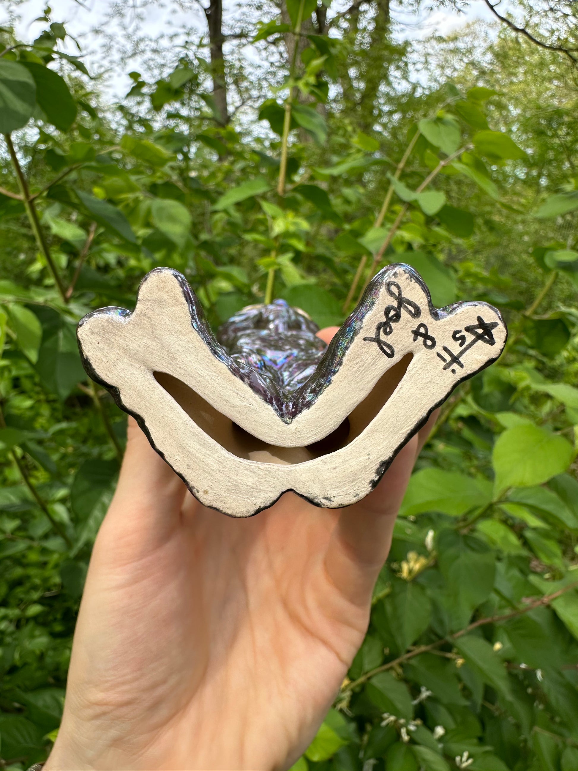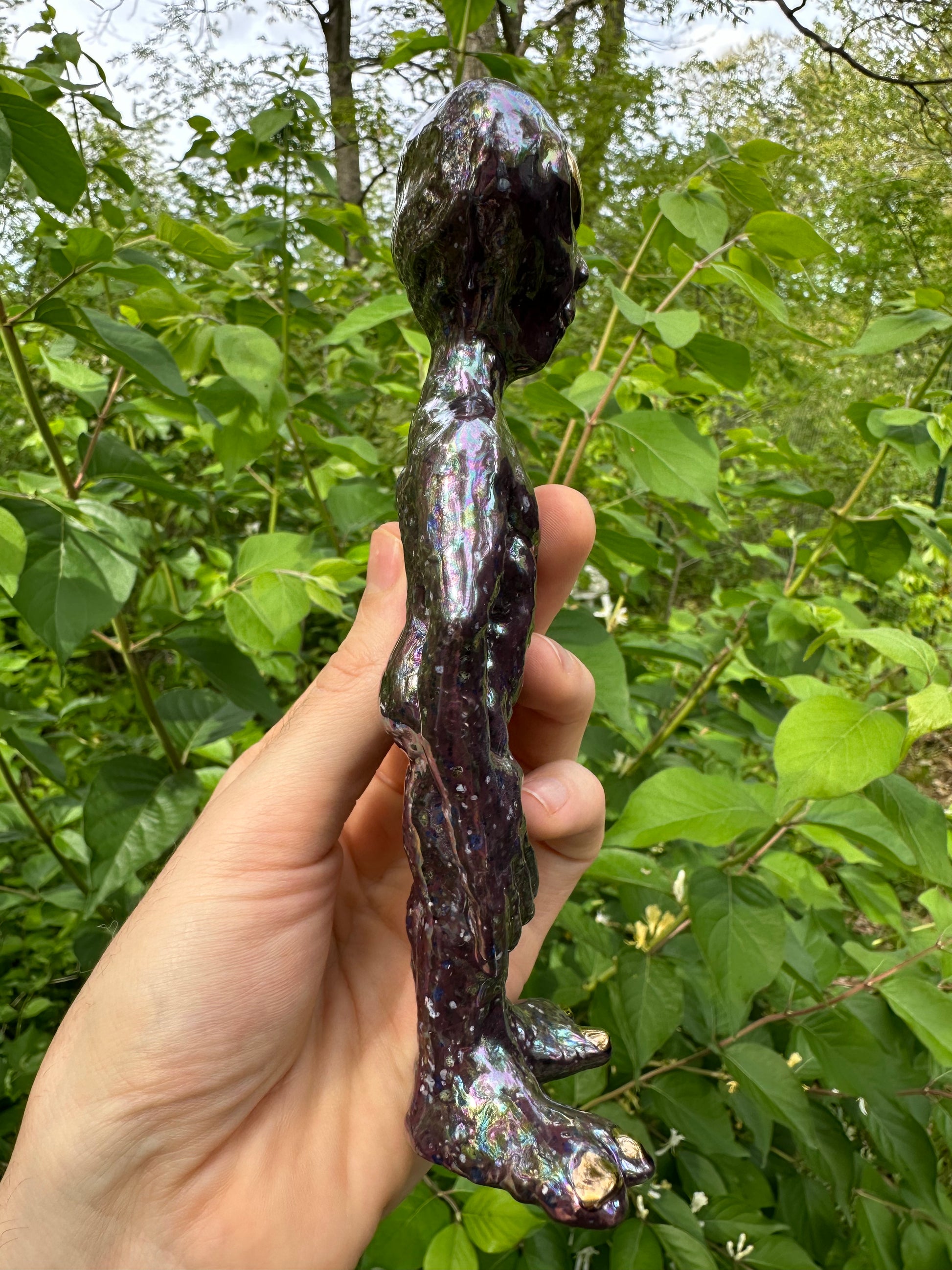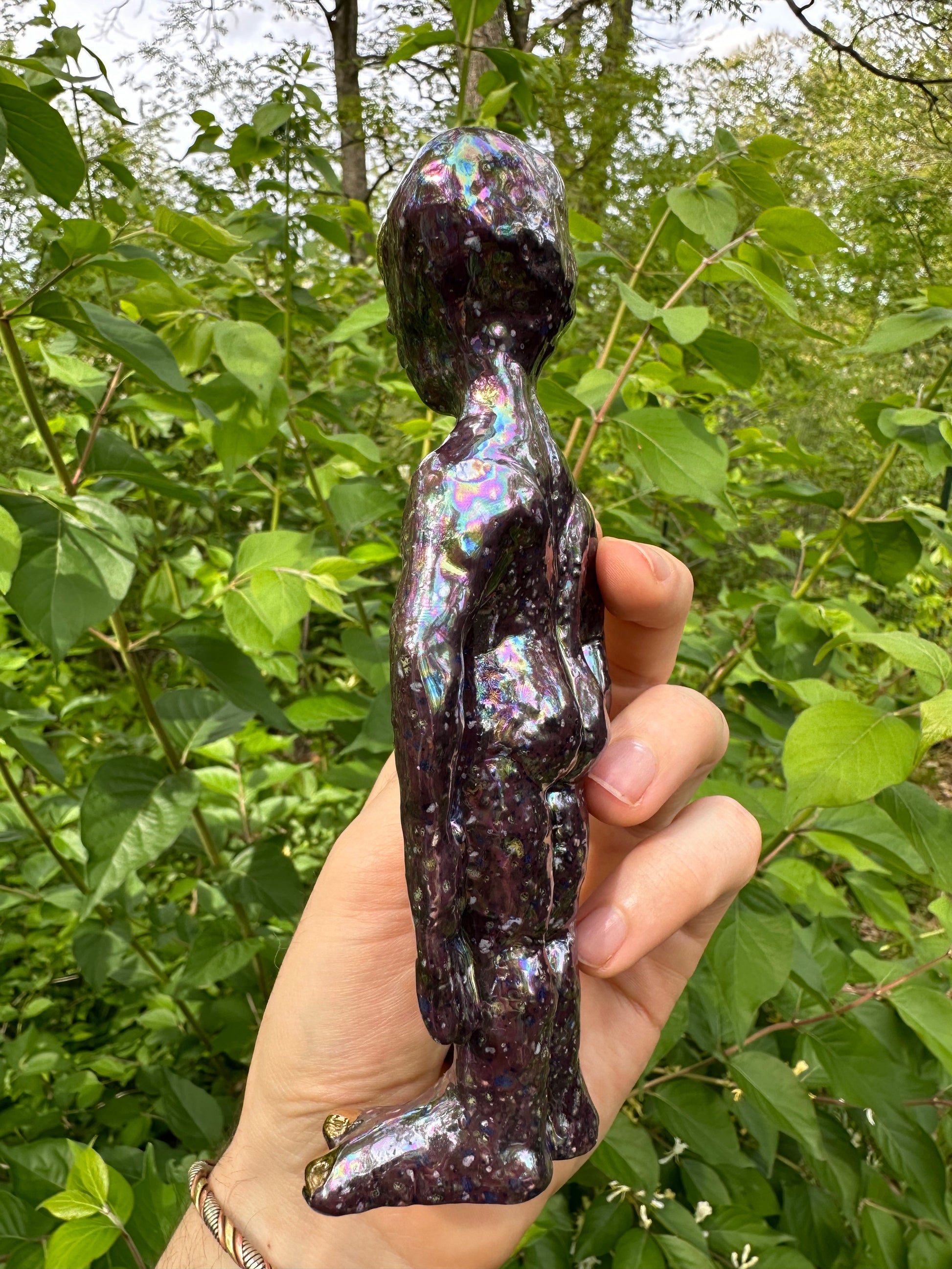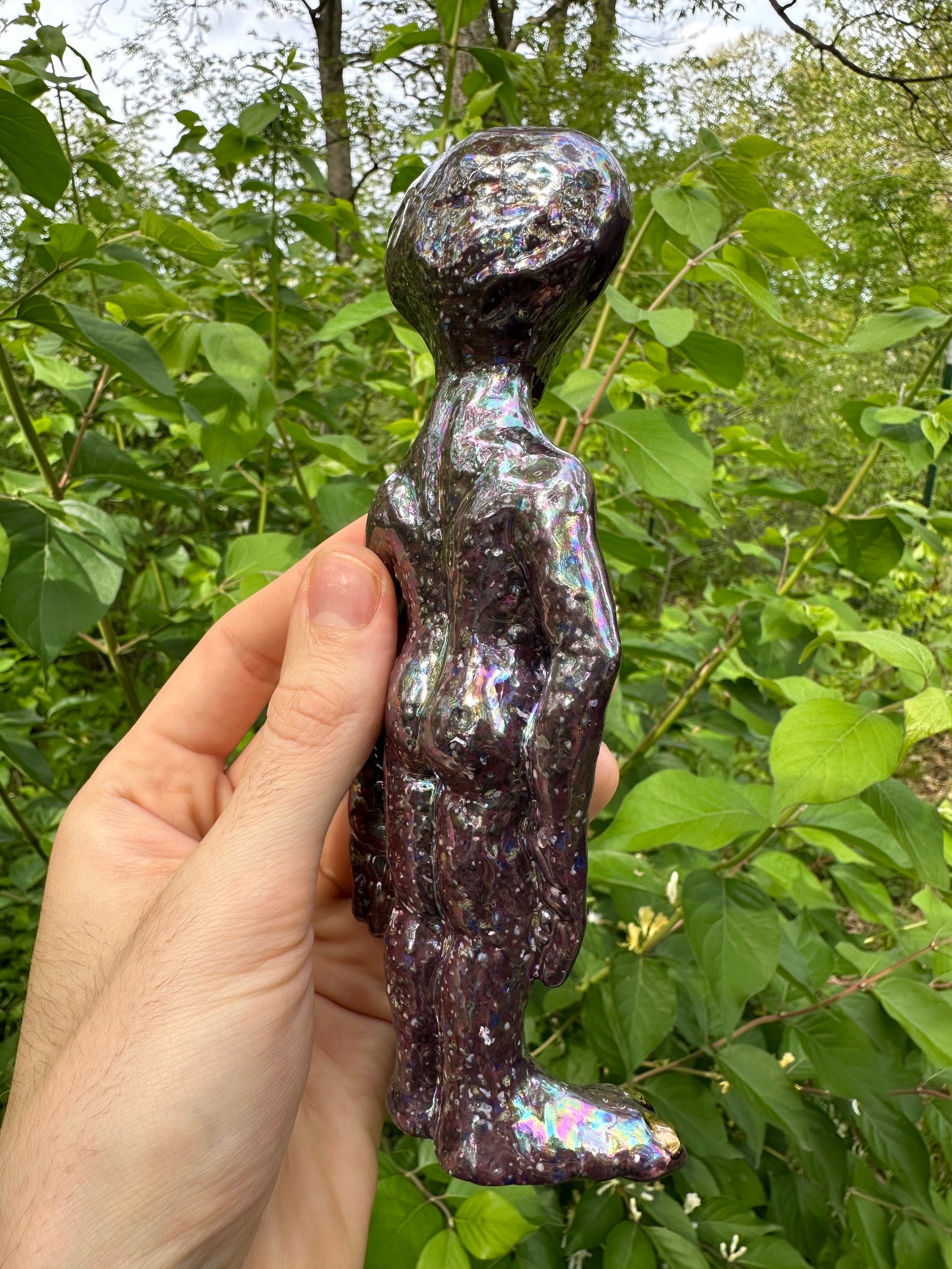 Meet your new cosmic companion — our handmade ceramic alien figure! Uniquely crafted with shimmering, iridescent glazes and finished with dazzling gold accents on the eyes and toes that sparkle like stardust. This curious extraterrestrial radiates mystery, charm, and out-of-this-world vibes — perfect for adorning your shelves, sparking conversation, or gifting to someone who believes the truth is out there. A stellar addition for collectors or anyone who loves the unusual, this little being is sure to bring otherworldly joy to those seeking the extraordinary.