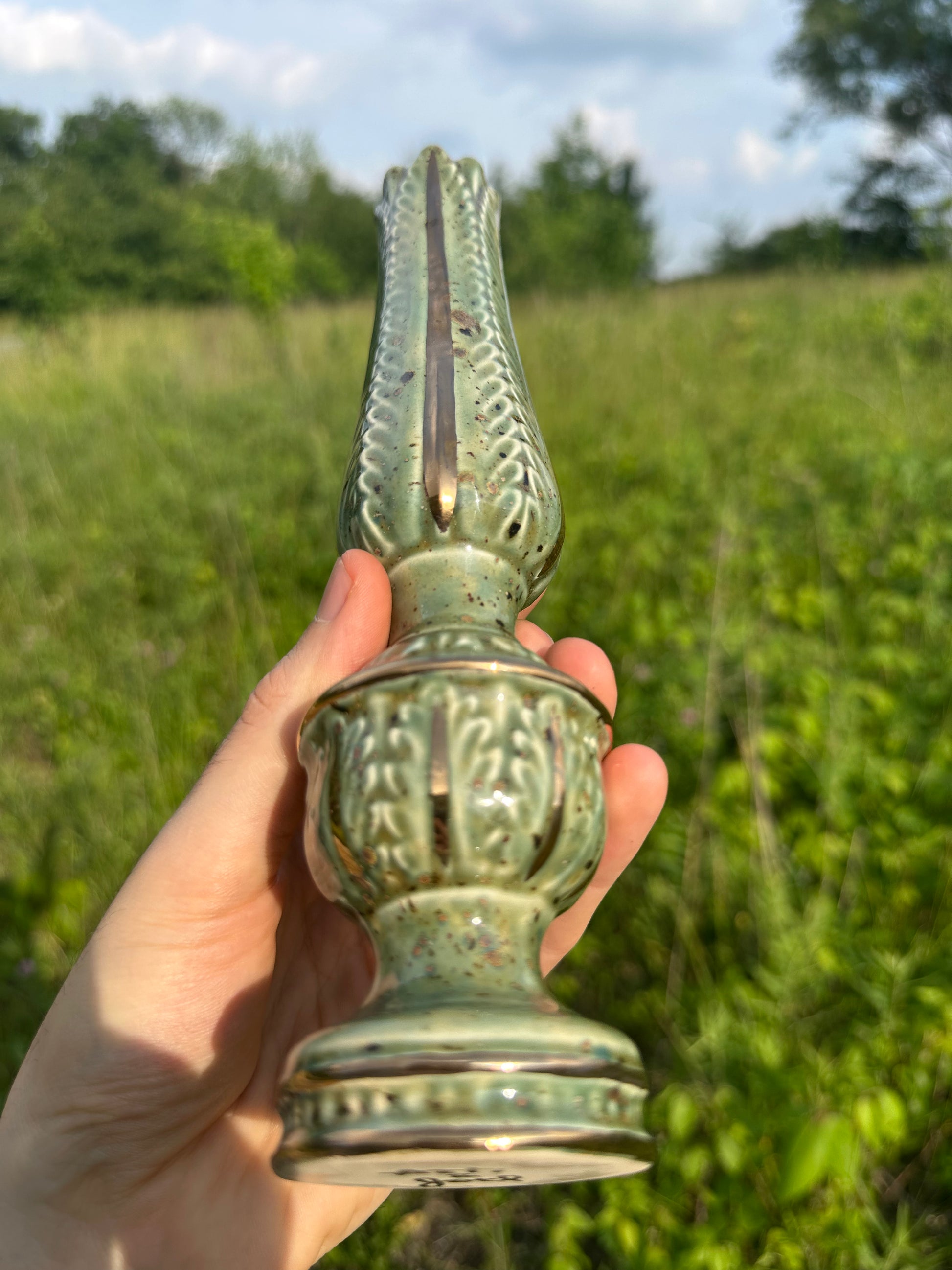 Unearthed from a forgotten garden, these handmade ceramic vases carry the timeless charm of a bygone era. Each one is crafted using a vintage plaster mold, preserving sculpted leaf and stem details that feel both nostalgic and naturally elegant. The flowing, organic shapes and bulbous forms give each piece a rooted, earthy presence—like something rediscovered rather than newly made. Finished with soft, glossy glazes and subtle gold accents, these vases offer a quiet sparkle that catches the light just right. Whether holding blooms or standing on their own, they bring a thoughtful blend of history, craft, and beauty to any space.