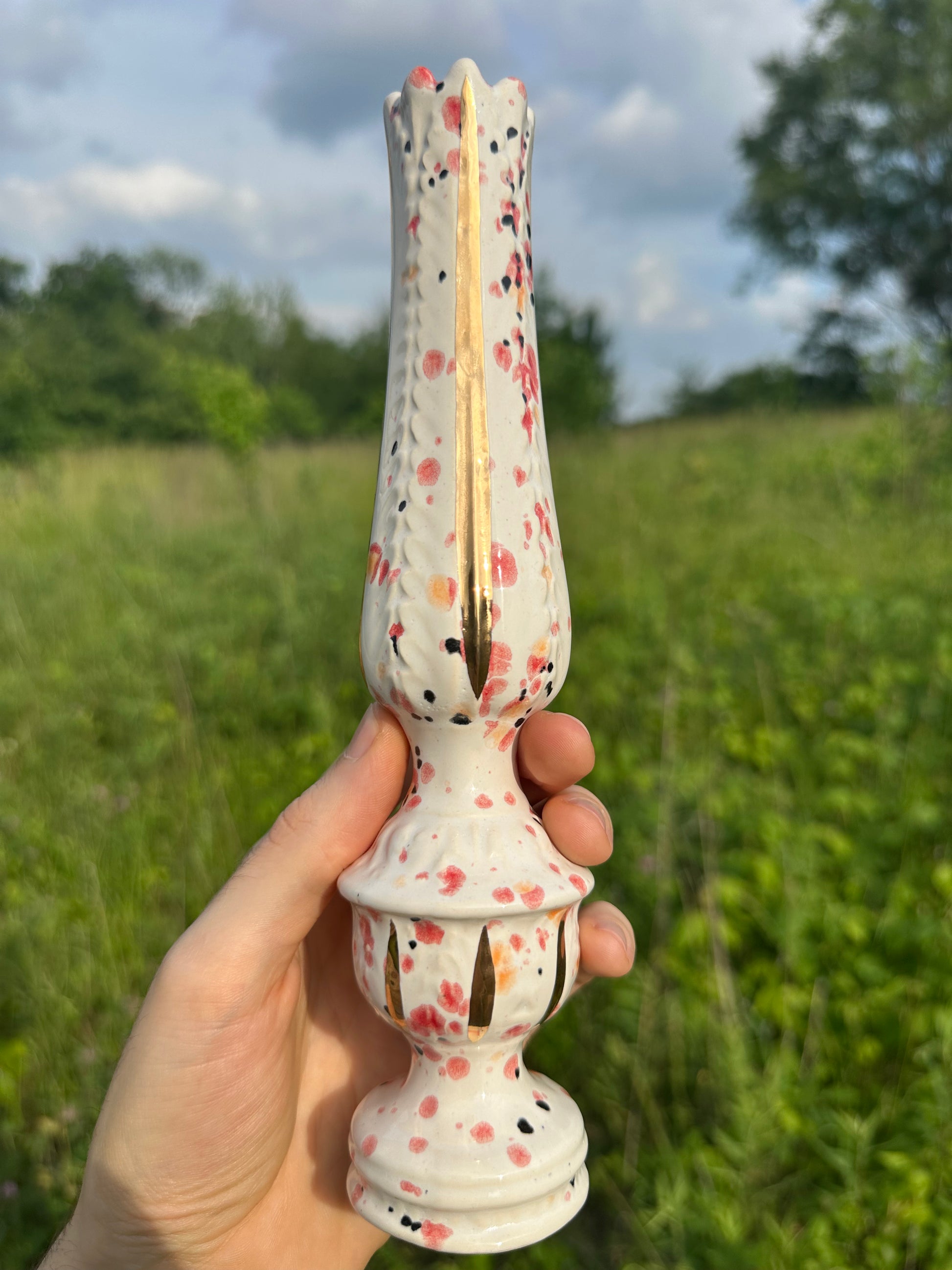 Unearthed from a forgotten garden, these handmade ceramic vases carry the timeless charm of a bygone era. Each one is crafted using a vintage plaster mold, preserving sculpted leaf and stem details that feel both nostalgic and naturally elegant. The flowing, organic shapes and bulbous forms give each piece a rooted, earthy presence—like something rediscovered rather than newly made. Finished with soft, glossy glazes and subtle gold accents, these vases offer a quiet sparkle that catches the light just right. Whether holding blooms or standing on their own, they bring a thoughtful blend of history, craft, and beauty to any space.