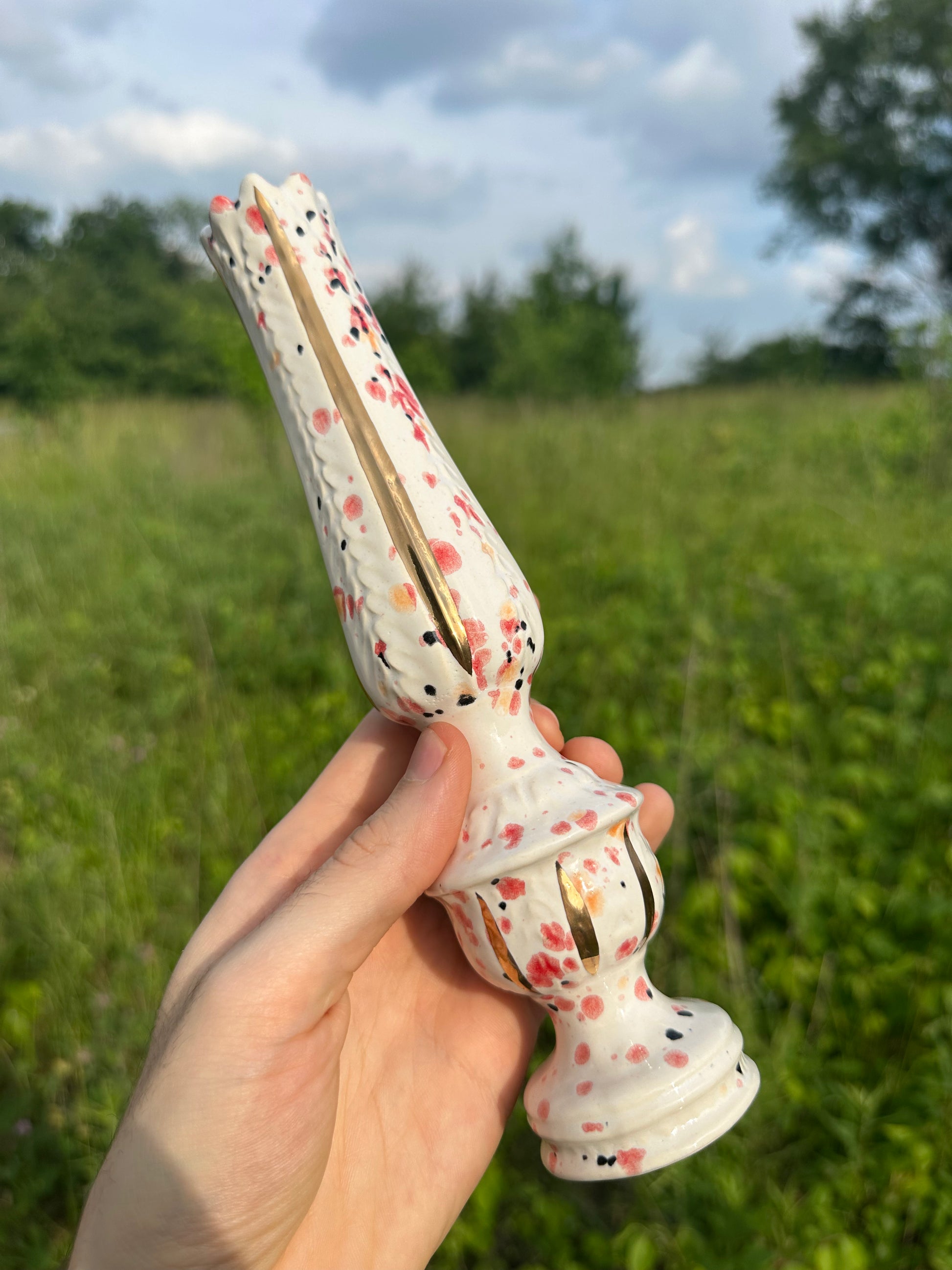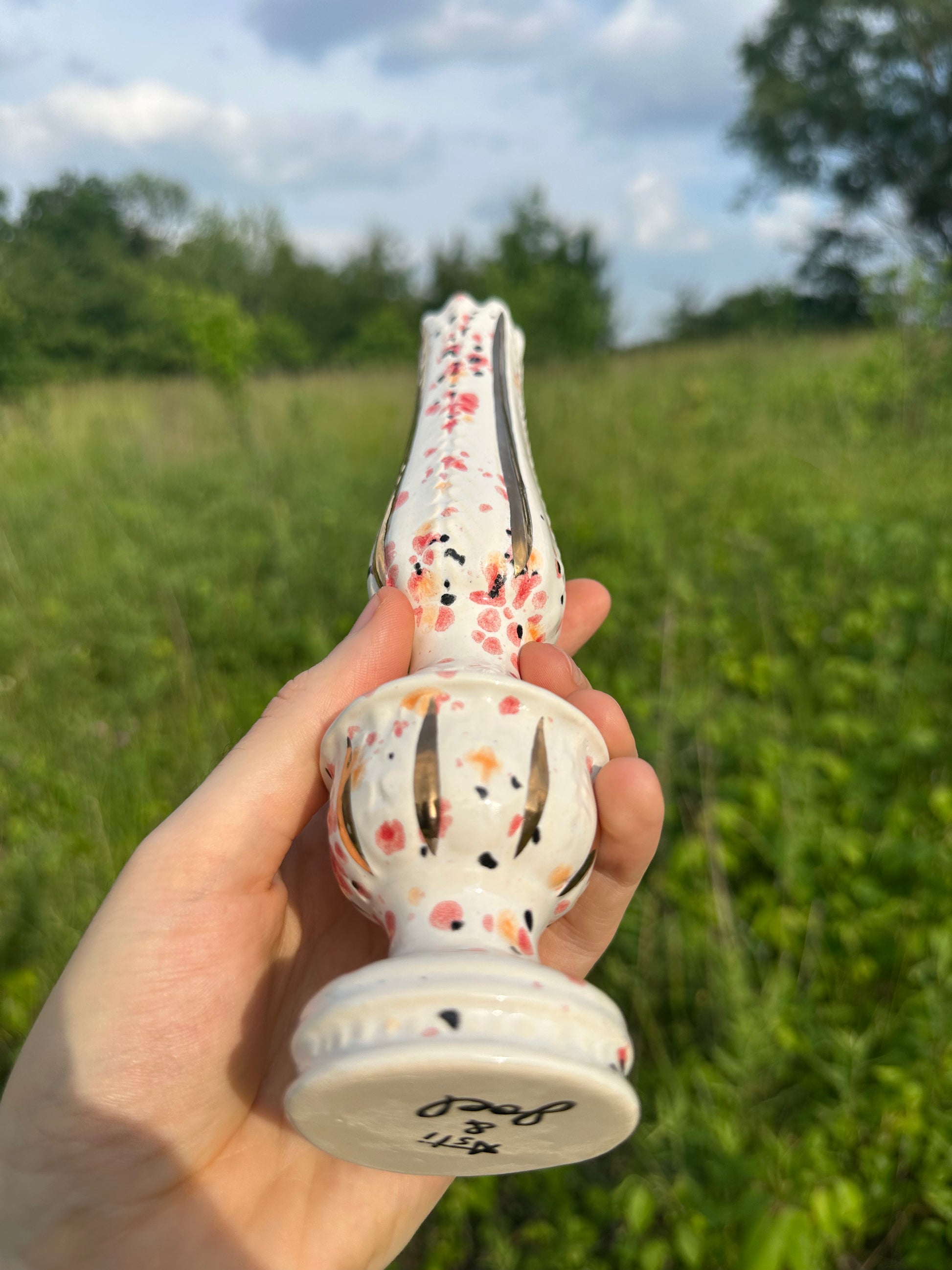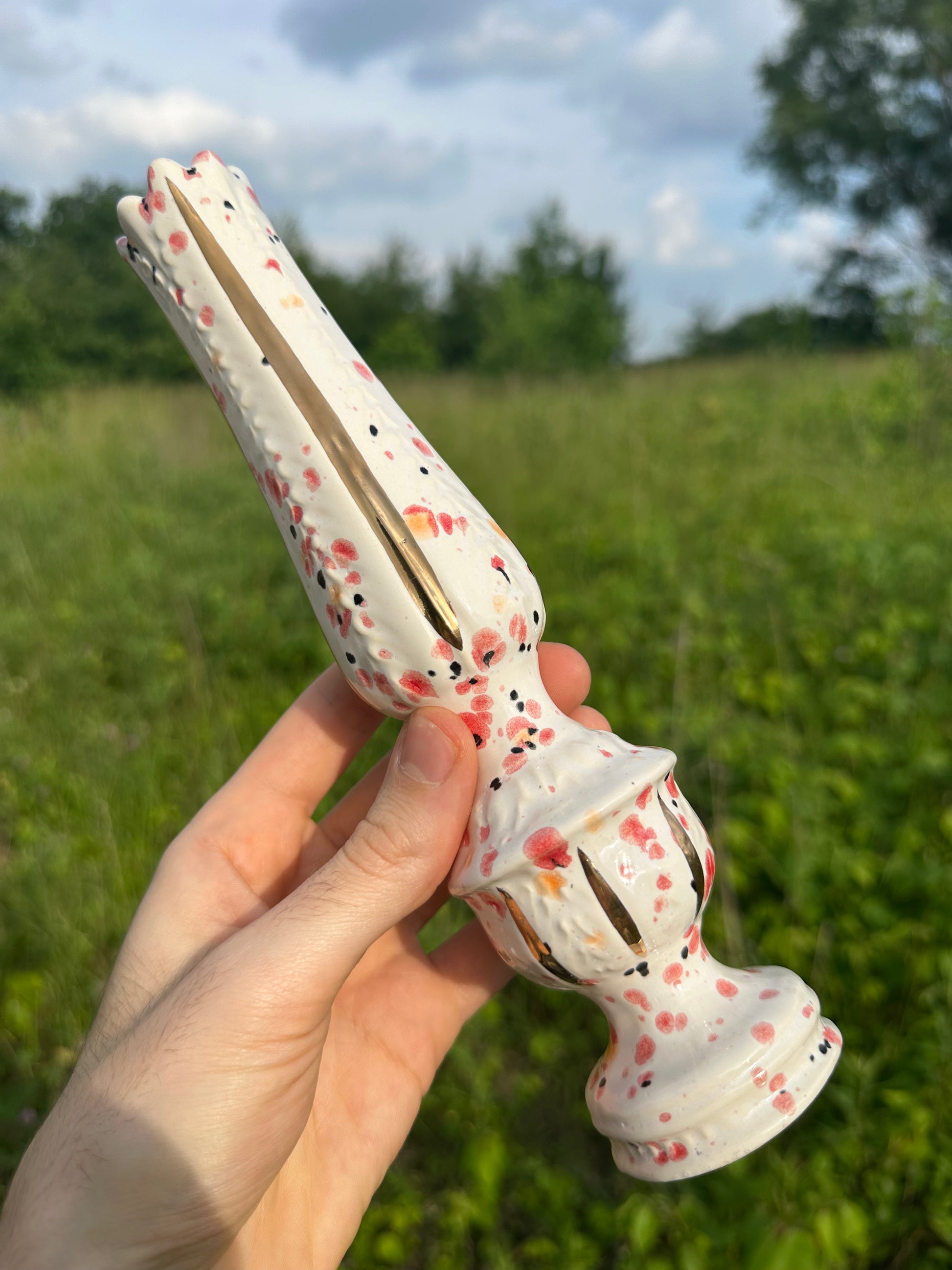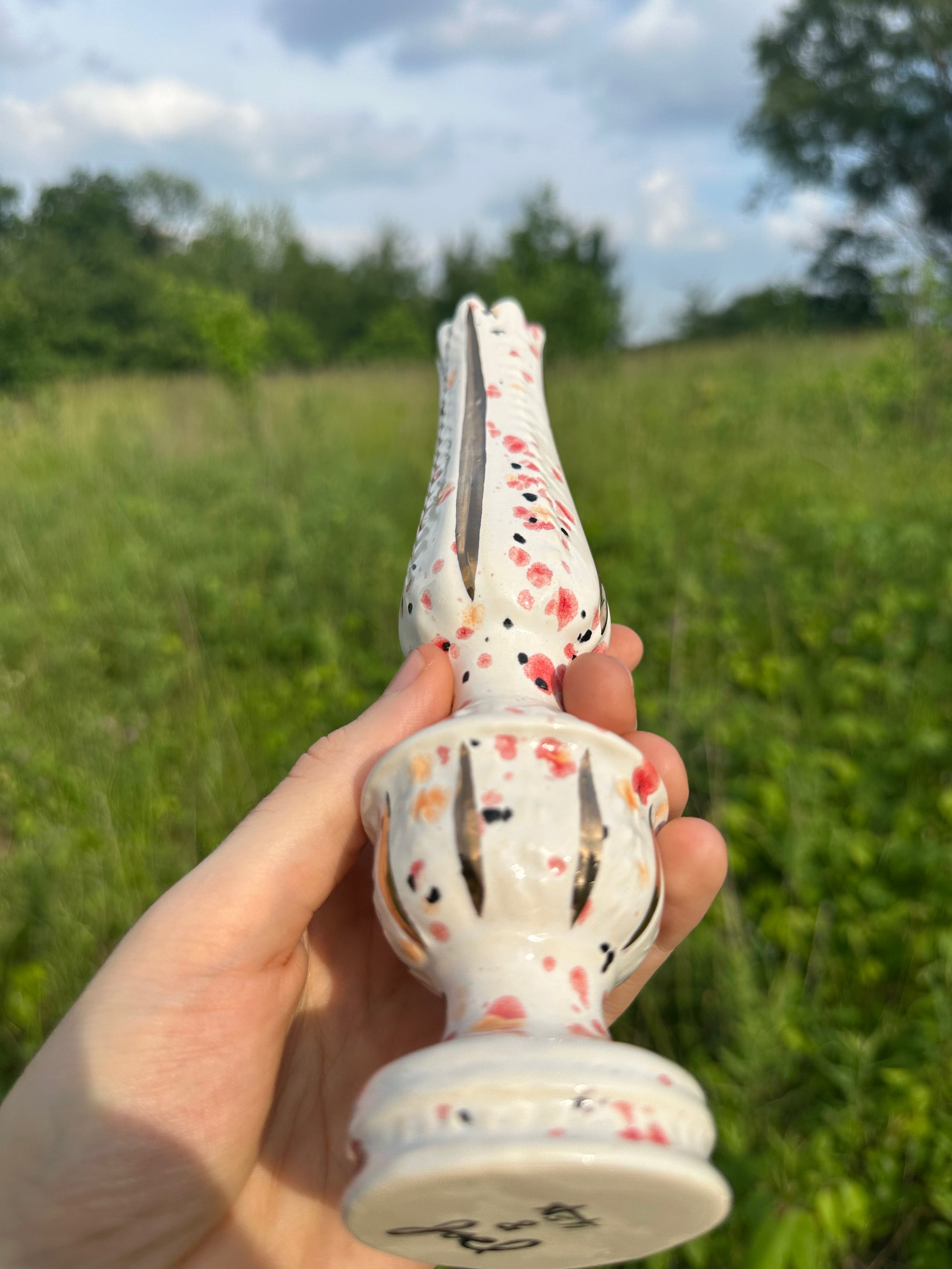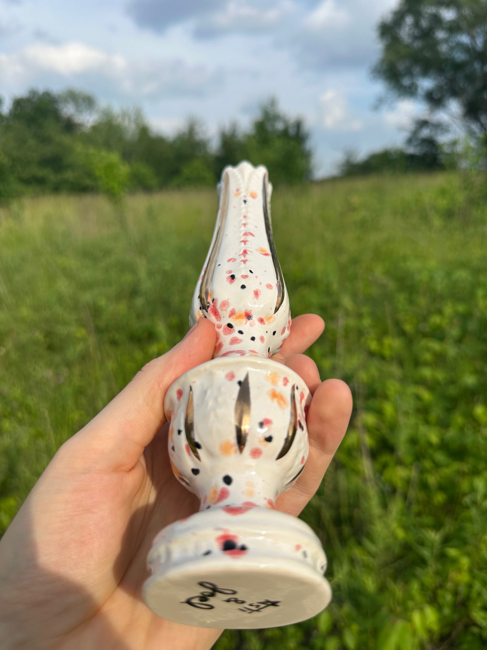 The Crafting Process: Each piece begins with liquid earthenware slip poured into a vintage plaster mold. After sitting for about 20 minutes, the excess slip is poured out, and the mold must rest until the next day before it can be opened. This waiting period ensures the clay is firm enough to release cleanly without warping. Because the mold needs time to dry out between pours, we can only use each one once a day. Once removed, the piece is carefully trimmed by hand — a slow and detailed process that requires patience and precision. After drying completely, it is bisque fired, then thoughtfully hand-painted with underglazes. It returns to the kiln for a glaze firing, where it transforms into a vibrant, durable, and silky-smooth ceramic figure. If adorned with luster or gold accents, it undergoes a third firing to achieve its shimmering finish.